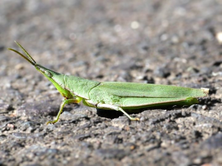 「ショウリョウバッタ」は本州から沖縄にかけて分布するバッタ科ショウリョウバッタ亜科のバッタです。成虫の出現時期は8月から11月で,草原などのほか人家周辺でも見ることができます。 日本に分布するバッタの中では最大です。8月の旧盆(精霊祭)の頃に姿を見せ,精霊流しの精霊舟に似ていることが名前の由来になっています。雄は飛ぶときに「チキチキ…」と音を出すところから「チキチキバッタ」と呼ばれています。