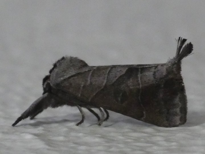 「セグロシャチホコ」は北海道から沖縄にかけて分布するシャチホコガ科ツマアカシャチホコ亜科のガです。成虫の出現時期は5月から10月で,幼虫の食餌であるヤナギやポプラ,イイギリなどのそばで見ることができます。 翅は淡褐色で,頭部から胸部背が濃褐色をしています。雄は腹部を反らして腹部の先が見えますが,雌は腹部を反らすことはありません。 上の写真は雌で下の写真は雄ですが,下の写真は早朝にフラッシュなしで撮ったので全体が暗くなっています。