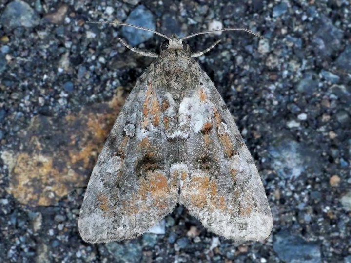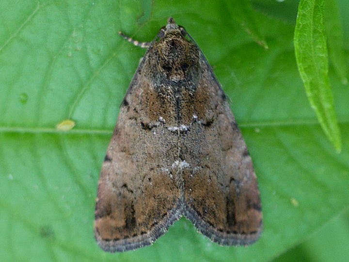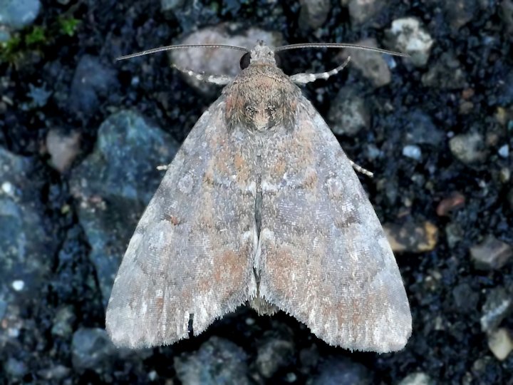 「マエホシヨトウ」は北海道から九州にかけて分布するヤガ科ヒメヨトウ亜科のガです。成虫の出現時期は8月から10月で,写真は標高300m程度の山道で撮りました。 翅の色は黒褐色から淡褐色まで色彩の変異があります。内横線と外横線は前縁付近では大きく開いているのに対し,後縁付近では幅が狭くなり白色の部分が見られます。幼虫はミゾソバなどを食餌にしています。