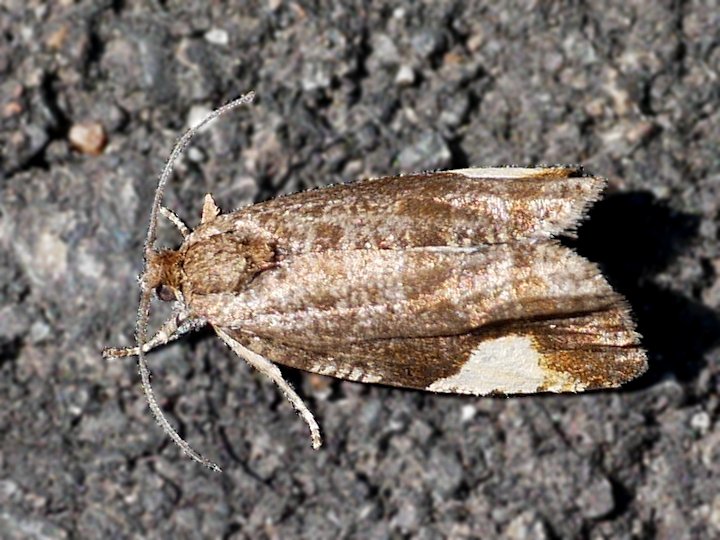 「コシロモンヒメハマキ」は北海道から四国にかけて分布するハマキガ科ヒメハマキガ亜科のガです。成虫の出現時期は4月から9月で,写真は標高300m程度の山道で撮りました。 翅は黒褐色が一般的ですが写真の個体は褐色をしています。前翅前縁には半円状の白紋があります。本種は「シロモンヒメハマキ」に似ていますが,シロモンヒメハマキは白紋の前縁にヒメハマキ特有の紋様がないのに対し,本種は白紋の前縁にヒメハマキ特有の紋様(暗色の短い線の並び)があります。