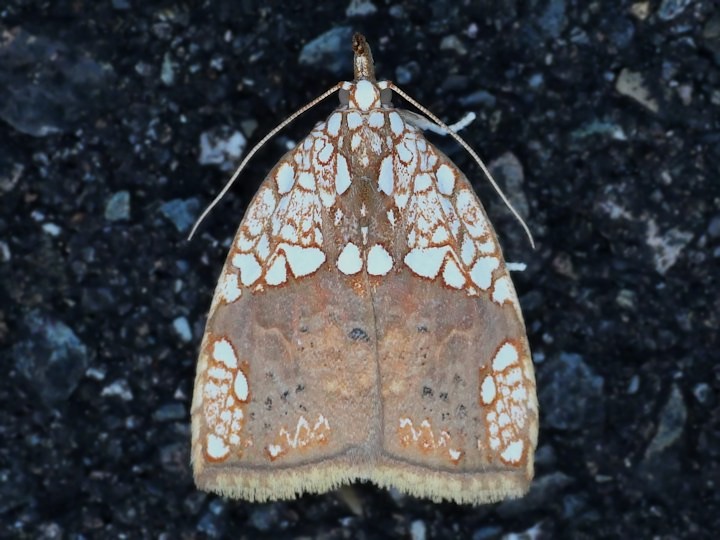 「ハイイロリンガ」は本州から九州にかけて分布するコブガ科リンガ亜科のガです。成虫の出現時期は5月から10月で,写真は標高300m程度の山道で撮りました。 前翅は白地に褐色の網目模様があり,翅端側には大きな褐色の紋があります。前翅の色彩には変異があり,橙色から黒褐色のものまで様々なものがいます。幼虫はヌルデの葉を食餌にしています。