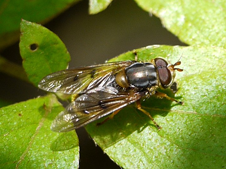 「スズキフタモンハナアブ」は北海道から九州にかけて分布するハナアブ科ハナアブ亜科のアブです。成虫の出現時期は5月から8月で,主に山地の花の咲いている周辺で見ることができます。 体色は濃茶褐色で胸部背には灰色の筋模様があり,触角の先は丸く平たい形をしています。また翅には2対の黒紋があります。