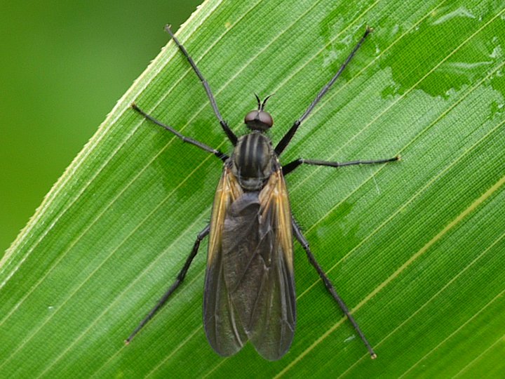 「キバネオドリバエ」は本州に分布するオドリバエ科オドリバエ亜科のハエです。成虫の出現時期は4月から5月で,平地から低山の林縁などで見ることができます。 胸部背には黒い3本の縦筋があり,翅の基部から前縁にかけて黄褐色をしています。本種は「キバネオオヒラオオドリバエ」の別名があります。