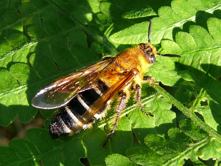 腹部が長く,胸部は黄褐色の毛が密集しています。雄は触角が長く,腹部に黄色い帯紋が4本あります。雄は「オオハラナガツチバチ」とよく似ていますが,腹部の帯紋がオオハラナガツチバチは白っぽく細いのに対し,キンケハラナガツチバチは黄色で太いことで見分けることができます。