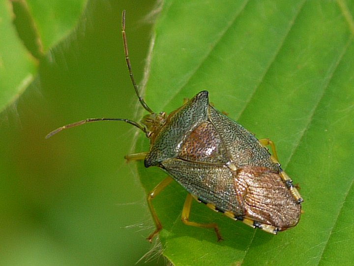 「セアカツノカメムシ」は北海道から九州にかけて分布するツノカメムシ科のカメムシです。成虫の出現時期は5月から10月で,平地から山間部の樹木の上で見ることができます。 全身は青みがかった緑色で,小楯板と呼ばれる背中中央部の三角部分が赤っぽい色をしています。雄は腹部の先に赤く短いハサミがついていますが,写真の個体はないので雌です。 →セアカツノカメムシ(雄)