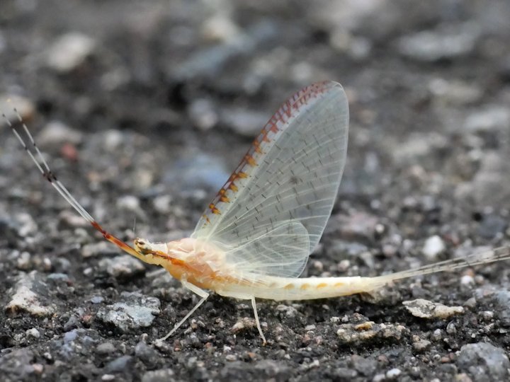 「キイロカワカゲロウ」は本州から九州にかけて分布するカワカゲロウ科カワカゲロウ属のカゲロウです。成虫の出現時期は6月から9月で,山地や平地の渓流のほか,平地の流れのある場所で見られるほか夜間灯火に飛来します。 体色は黄色で,前翅前縁や胸部側面に赤褐色の斑紋があることで,判別できます。翅は半透明で淡黄色をしています。写真の個体は前脚が比較的短いので雌だと思われます。