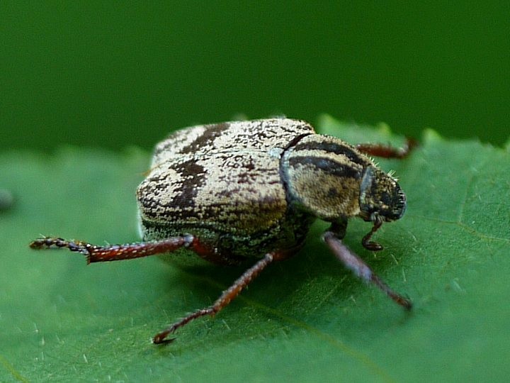 「ヒメアシナガコガネ」は北海道から九州にかけて分布するコガネムシ科アシナガコガネ亜科の甲虫です。成虫の出現時期は5月から8月で,いろいろな花や葉に集まります。 後脚が長く,体型は長楕円形をしています。地色は黒褐色から黒色をしていますが,ほぼ全面に鱗毛があるため,黄色に見えます。しかし上翅の模様や体色などは個体差があり,様々なタイプが見られます。
