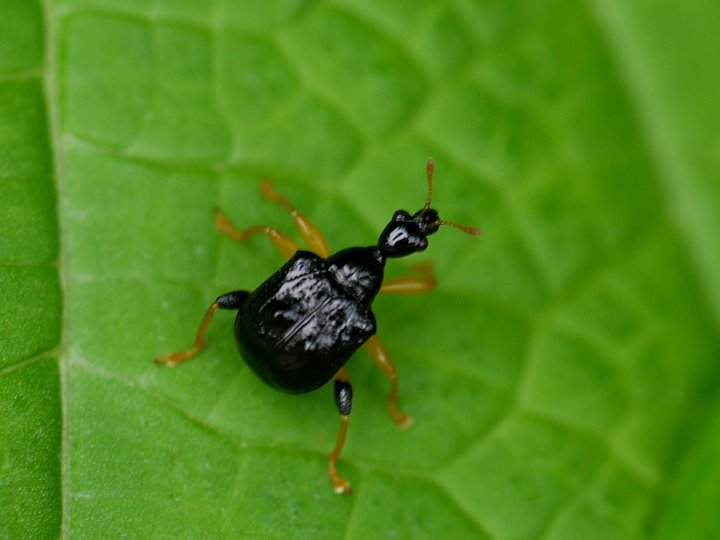 「ヒメコブオトシブミ」は本州から九州にかけて分布するオトシブミ科オトシブミ亜科の甲虫です。成虫の出現時期は4月から8月で,コアカソやカラムシなどの上で見ることができます。 体色は光沢のある黒色で,脚は黄色をしています。また後脚のつけ根部分は黒色で膨らんでいます。上翅の中央部分に一対のコブがあるのが名前の由来になっています。