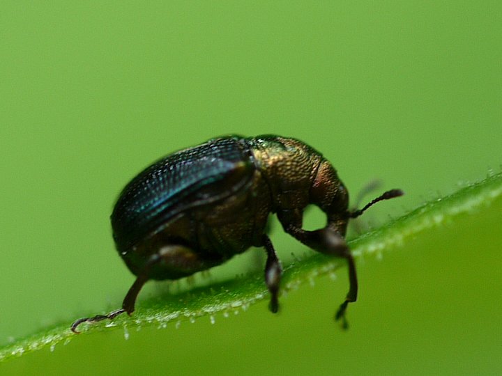 「カシルリオトシブミ」は本州から九州にかけて分布するオトシブミ科アシナガオトシブミ亜科のオトシブミです。成虫の出現時期は4月から8月で,平地から山地の林内や林縁などで見ることができます。 全体に金属光沢があり,頭部から前胸背部は金緑色で上翅は青色をしていますが,色彩には個体差があります。成虫はイタドリやカシ,コナラなどを食餌にしています。