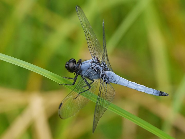 「オオシオカラトンボ」は北海道から沖縄にかけて分布するトンボ科トンボ亜科のトンボです。成虫の出現時期は5月から11月で,丘陵地などのやや薄暗い所などで見ることができます。 シオカラトンボに似ていますが,雄はシオカラトンボより色が濃く,翅のつけ根部分が青くなっていることで見分けることができます。