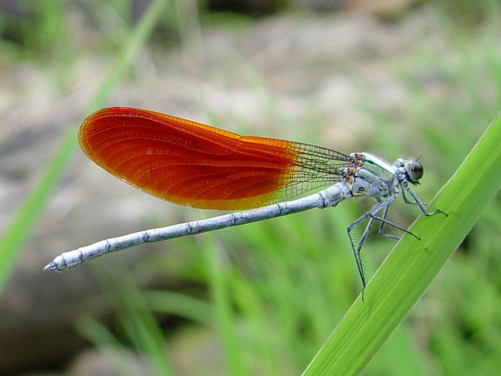 「ニホンカワトンボ」は北海道から九州にかけて分布するカワトンボ科カワトンボ亜科のトンボです。成虫の出現時期は4月から7月で,平地の河川から山地の渓流で見ることができます。 未成熟な個体はメタリックな青緑色で,成熟すると白い粉で覆われます。雄の翅は橙色,淡橙色,透明の3タイプがあり,雌の翅は淡橙色,透明の2タイプがあり,生息する地域によって異なるようです。