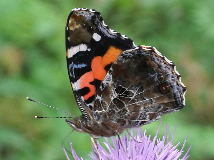 「アカタテハ」は北海道から沖縄にかけて分布するタテハチョウ科タテハチョウ亜科のチョウです。成虫の出現時期は3月から11月で成虫のまま越冬し,山地から住宅地までいろいろな環境で見ることができます。 前翅は黒色に朱色の模様があり,後翅は中央付近に茶色の長い毛が生えて翅端側には朱色の模様があります。幼虫は,カラムシやヤブマオ,イラクサなどのを食餌にしています。