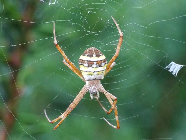 「コガタコガネグモ」は本州から沖縄にかけて分布するコガネグモ科コガネグモ属のクモです。成虫の出現時期は7月から10月で,林内や林縁のほか人家の生垣や畑地周辺などで見ることができます。 腹部の先端は濃褐色で,濃褐色の帯が1本あります。本種は「コガネグモ」に似ていますが,コガネグモの腹部には濃褐色の帯が2本あるのに対し,本種は1本であることで区別できます。 →コガネグモ