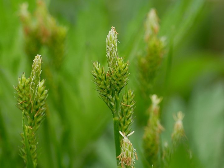 「アオスゲ」は北海道から九州にかけて分布するイネ目カヤツリグサ科スゲ属の多年草です。日当たりの良い道端や草地などに生育し,草丈は15cmから50cm程度になります。 根茎は短く密に叢生します。茎は細く,基部の鞘は光沢のある褐色をしています。花期は4月から5月で,頂小穂は雄性で棍棒状になり,側小穂は雌性で2個から3個を上部に接近してつきます。