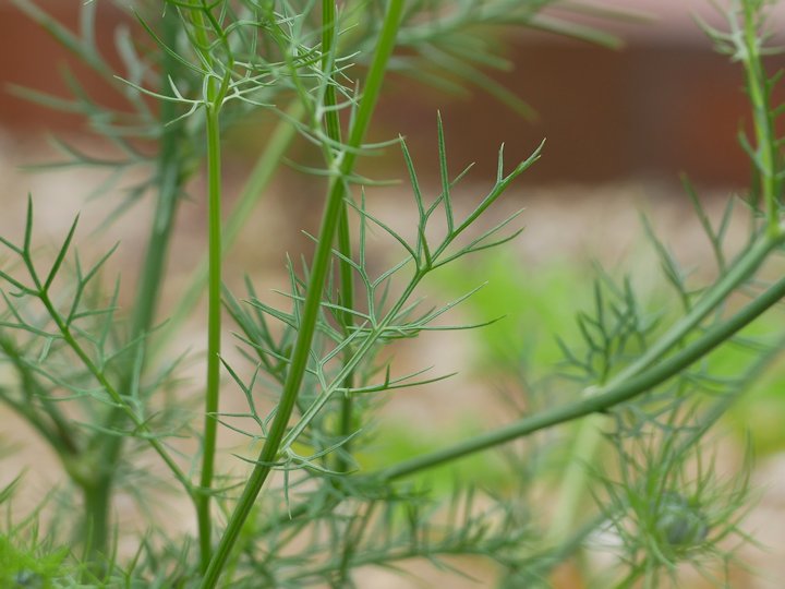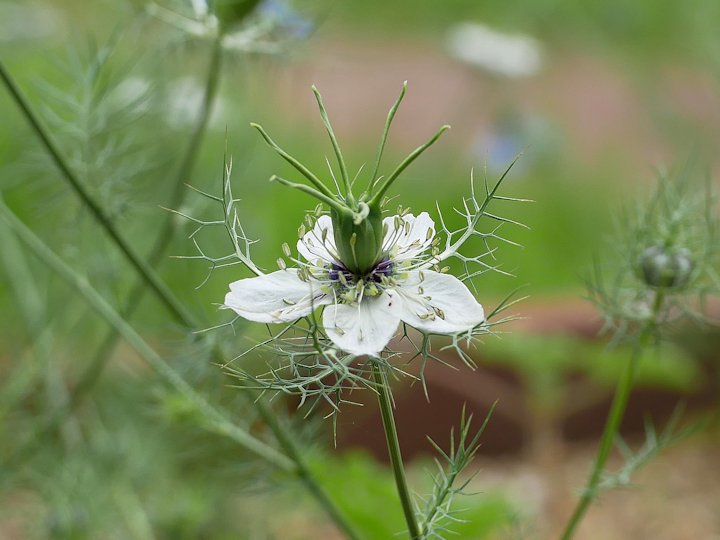 「クロタネソウ」は地中海沿岸地方原産のキンポウゲ目キンポウゲ科クロタネソウ属の一年草です。日本への渡来時期は江戸時代で,観賞用として植栽されました。 茎は直立し,草丈は40cmから100cmになります。葉は羽状複葉で,小葉は糸状に細く裂けます。花期は5月から7月で,枝先に青色や白色,紫色などの花を咲かせます。花後には風船のような実をつけ,その中に黒い光沢のある種子をたくさんつけます。本種は「ニゲラ」とも呼ばれます。