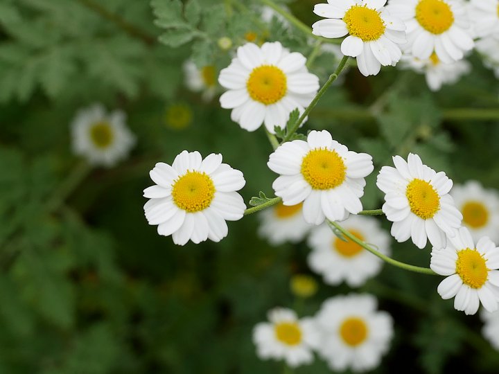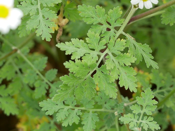 「カモミール」はヨーロッパから西アジア原産のキク目キク科ローマカミツレ属の一年草または二年草です。日本への渡来時期は江戸時代で,薬用植物として栽培が行われてきました。 茎は直立し,草丈は30cmから60cmになり,多数分枝します。葉は羽状複葉で2回から3回裂け,互生します。花期は5月から6月で,茎先に頭花を咲かせます。 本種の効能はリラックス効果,安眠効果,消化促進,鎮痛作用,保湿効果などがあり,ハーブティーや入浴剤,料理などに利用されます。