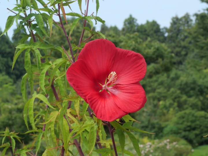 「タイタンビカス」はアオイ目アオイ科フヨウ属の多年草です。本種は2009年頃に,アメリカフヨウとモミジアオイを交配させて作出された新しい品種です。 草丈は1mから2m程度になります。葉は下部では3裂し,上部では5深裂します。花期は6月から9月で,大きな5弁の花を咲かせます。花は一日花で,大きな花を次々に咲かせていきます。