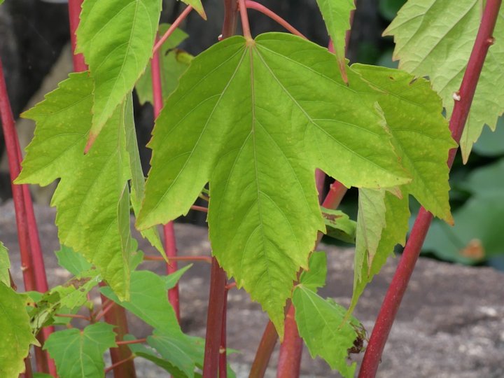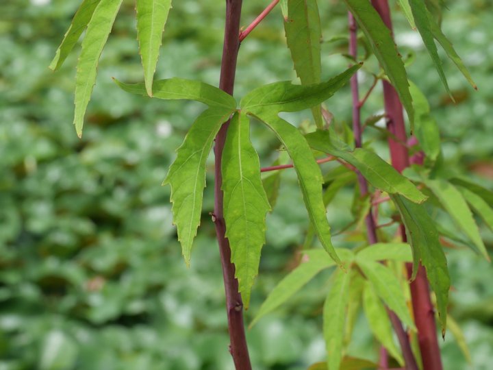 ↑上部の葉は5深裂で,↓下部の葉は3裂です。