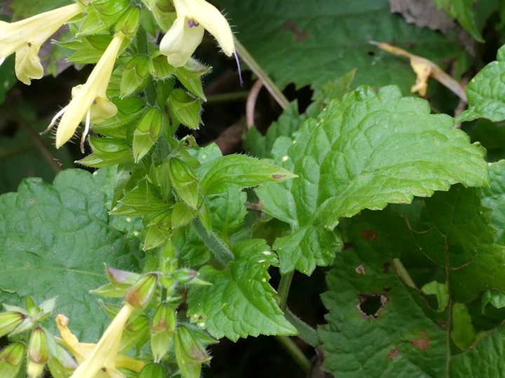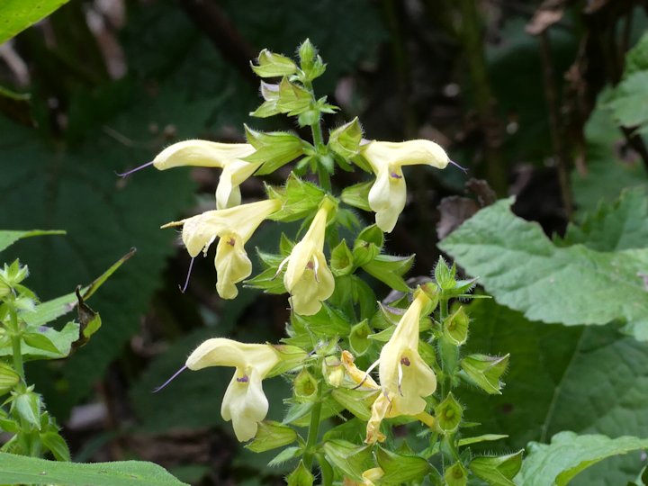 「キバナアキギリ」は,本州から九州にかけて分布するシソ目シソ科アキギリ属の多年草です。林縁のやや湿った場所に群生し,草丈は20cmから50cm程度になります。 短い地下茎があり,群生します。茎の断面は四角形をしていて毛が多く生えています。葉は三角状鉾形で淵には鋸歯があります。花期は8月から10月で,茎先に淡黄色の唇形の花を段になって咲かせます。名前の由来は,花が桐の花に似ているところから名前が付けられたそうです。