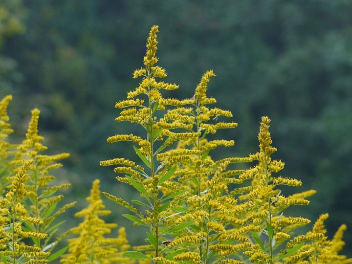 「セイタカアワダチソウ」は北海道から沖縄にかけて分布するキク目キク科アキノキリンソウ属の多年草です。北アメリカ原産の帰化植物であり,日本には明治時代に切り花などの観葉植物として導入されました。現在では河原や空き地などに群生し,草丈は1mから2.5m程度になります。 茎は途中で分枝せず直立します。葉は披針形で先は尖ります。花期は10月から11月で茎の先に円錐花序をつけ黄色の花を多数咲かせます。