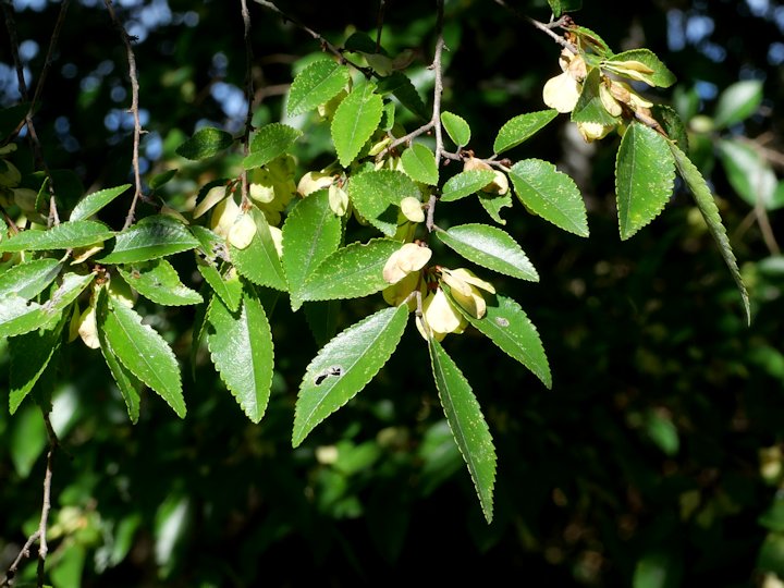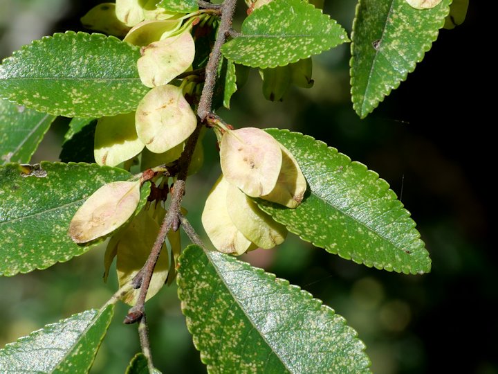 「アキニレ」は本州の東海地方から九州にかけて分布するバラ目ニレ科ニレ属の落葉高木です。河原などの水辺などに生育し,樹高は13mから15m程度になります。 樹皮は灰褐色で小さな皮目があります。葉は倒卵形から長楕円形で縁には鋸歯があり互生します。花期は9月頃で,葉腋から淡黄色の花を多数咲かせます。花後には実をつけますが,実は翼果で楕円形の薄い翼を持った形をしていて,熟すと風に乗って遠くまで飛んでいきます。