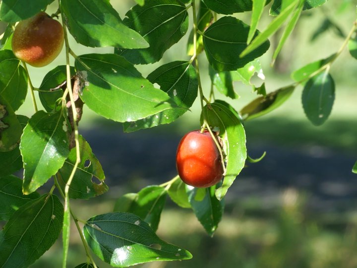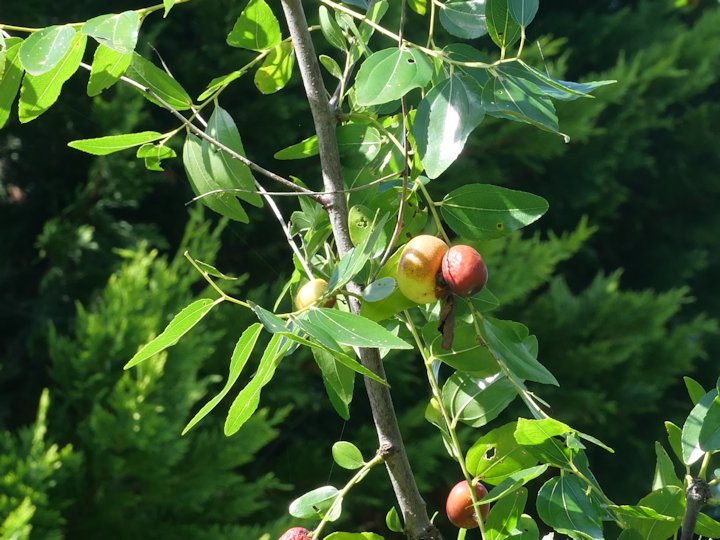 「ナツメ」は中国から西アジア原産のバラ目クロウメモドキ科ナツメ属の落葉高木です。日本には平安時代頃に渡来したといわれ,実が菓子材料として食用したり,生薬として用いられたりするため,各地で植栽されています。 樹高は10mから15m程度になり,葉は卵形で光沢があり互生します。花期は5月から7月で,葉腋に淡黄色の小さな花を咲かせます。花後には楕円形の実をつけますが,成熟するにつれて赤色になります。 →ナツメ(花)