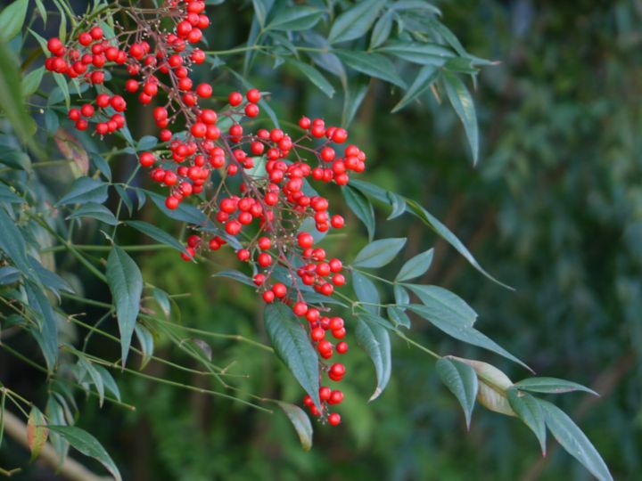「ナンテン」は関東以南の比較的暖かい山林に自生するキンポウゲ目メギ科の常緑樹低木です。元々は中国原産であり,日本に自生しているものは栽培種が野生化したものだといわれています。 昔から「難を転ずる」と言われ,縁起のよい木とされ,庭木として植えられています。