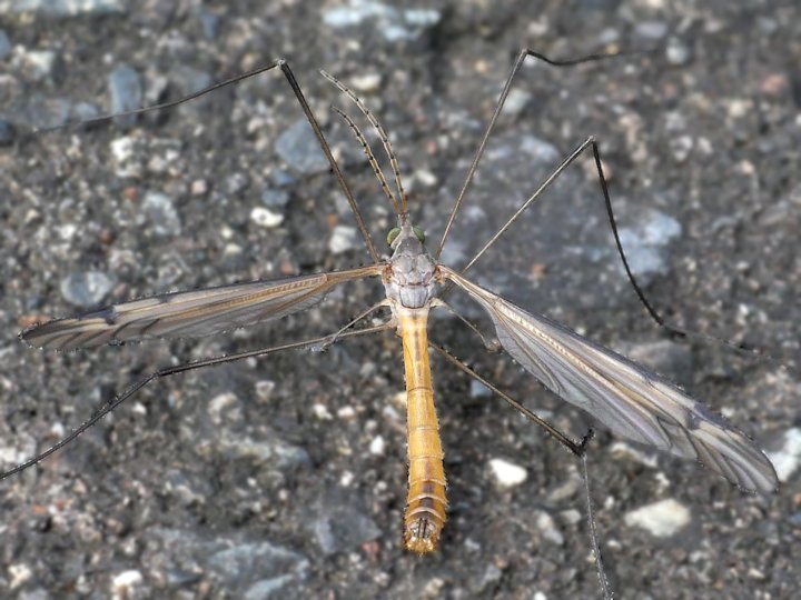 「キゴシガガンボ」は本州から九州に分布するガガンボ科ガガンボ亜科のガガンボです。成虫の出現時期は5月から6月で,林縁や渓流沿いなどで見ることができます。 胸部は黒色で,腹部のほとんどが黄色からオレンジ色をしています。ガガンボは普通は植物の葉や枝にぶら下がるように止まりますが,写真の個体は地面にいるのでかなり弱っている状態だと思われます。