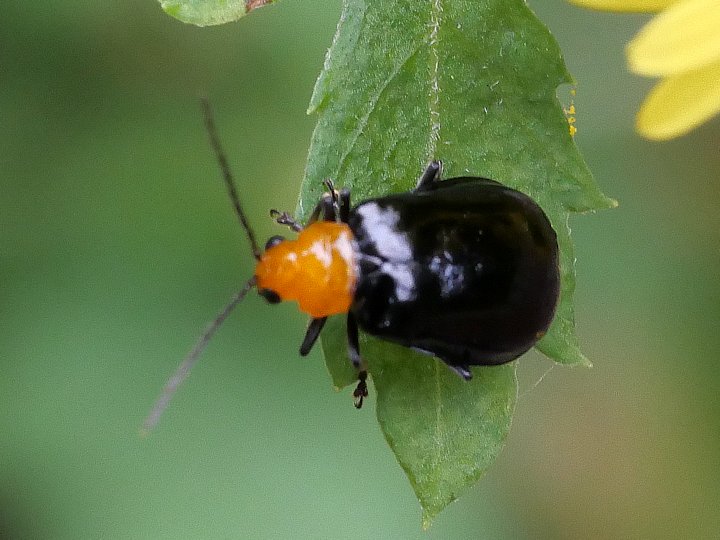 「クロウリハムシ」は本州から九州にかけて分布するハムシ科ヒゲナガハムシ亜科の甲虫です。成虫の出現時期は5月から10月で,成虫のまま越冬します。 成虫はウリ科植物の他,野菜や花などいろいろな植物を食害するので,害虫として扱われます。体色はオレンジ色で上翅と足は黒色をしています。