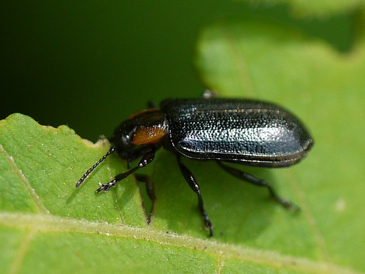 「クルミハムシ」は北海道から九州にかけて分布するハムシ科ハムシ亜科のハムシです。成虫の出現時期は5月から8月で,主に山間部などで見ることができます。 体は扁平で黒っぽい色をしており,前胸背部の側面は黄褐色をしています。オニグルミやサワグルミを食草にしていることが名前の由来になっています。