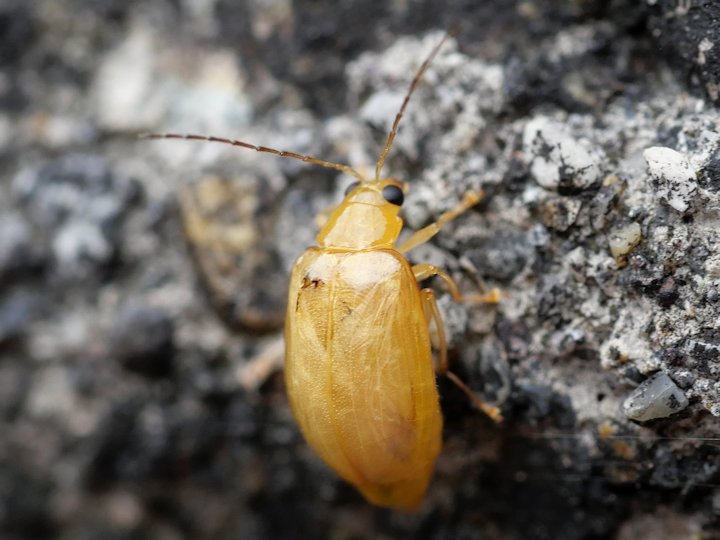 「キイロクワハムシ」は本州から沖縄にかけて分布するハムシ科ヒゲナガハムシ亜科の甲虫です。成虫の出現時期や生息地などは不明ですが,クワやコナラ,タラノキなどを食樹にしています。 体色は触角や脚も含めて淡黄色をしています。「ウリハムシ」に似ていますが,ウリハムシより色が薄く弱々しい印象を受けます。以前は「ウスイロウリハムシ」とよばれていましたが,ウリ科植物には寄生しないことなどから,改名されたようです。