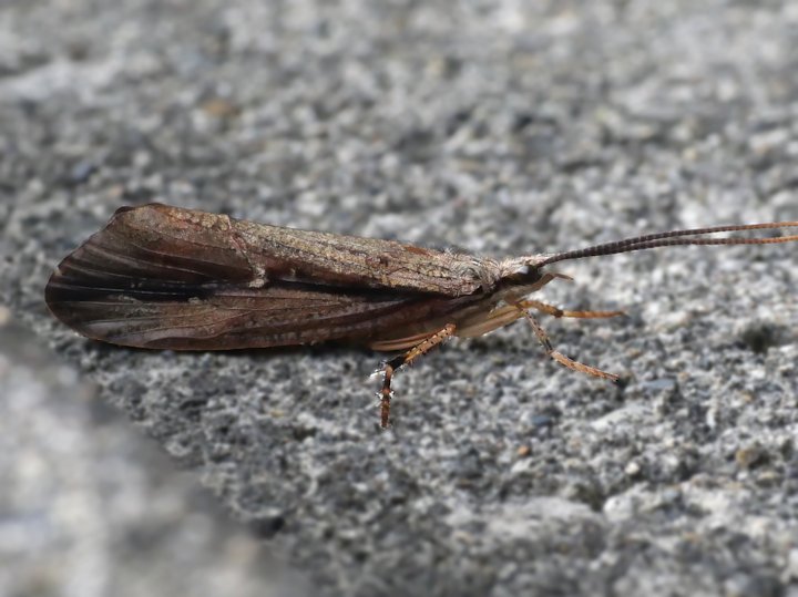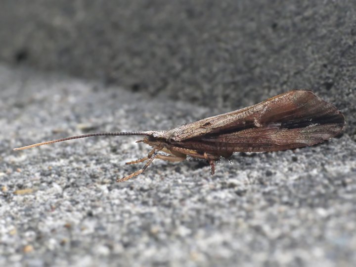 「ツマグロトビケラ」は北海道から九州にかけて分布するトビケラ科ツマグロトビケラ属のトビケラです。成虫の出現時期は7月から10月頃までで,ため池や湖沼周辺で見ることができ,夜間灯火に飛来します。 前翅は褐色で中央部を縦断する黒色紋があります。また前翅中央付近に2個の淡黄色の斑点があります。