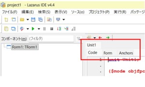 の2つです。「unit1.pas」は正常に開いているように見えますが,「実行」を押すと,コンポーネントのない,ただのフォームが表示されます。