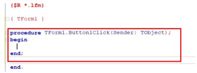 ボタンが表示されたら,次にそのボタンをダブルクリックします。すると画面が,フォームエディタからコードエディタに切り替わり,下の赤い四角の文字列が追加されています。この文字列のカーソルがある部分にプログラムを書けば,ボタンを押したときにイベントを発生させることが出来ます。