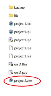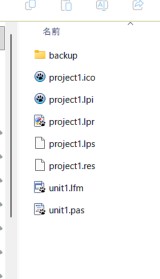 ファイルが保存できたら,保存したファイルを開いて「実行」してみてください。すると今度は,右の図のように新しいファイルが作られていると思います。このファイルの拡張子は「exe」で,これは実行型のファイルです。このファイルを開くとlazarusを開くことなく,作成したフォームが現れたと思います。これがいわゆる「自作ソフト」になります。