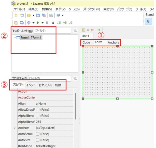 次に,Aの「コンポーネント」を見ると,「Form1」が表示されています。ここにはフォームの上に置かれたコンポーネントが表示されますが,今はフォームの上にコンポーネントが置かれていないので,「Form1」だけが表示されています。