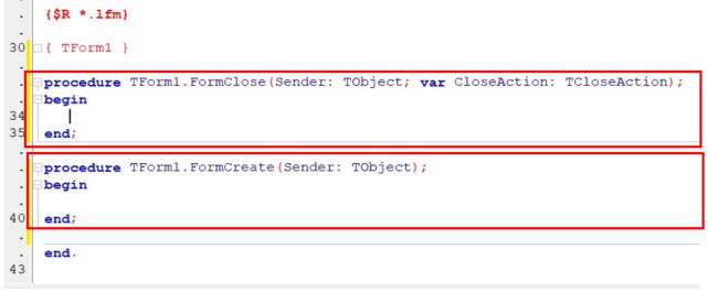 まず,[OnCreate]と[OnClose]のイベントハンドラを呼び出します。左の図の[OnCreate]の右にある空欄でダブルクリックをすると,フォームエディタからコードエディタに切り替わり,イベントハンドラが書き込まれています。[OnClose]も同様に行うと,コードエディタが下図のようになっていると思います。