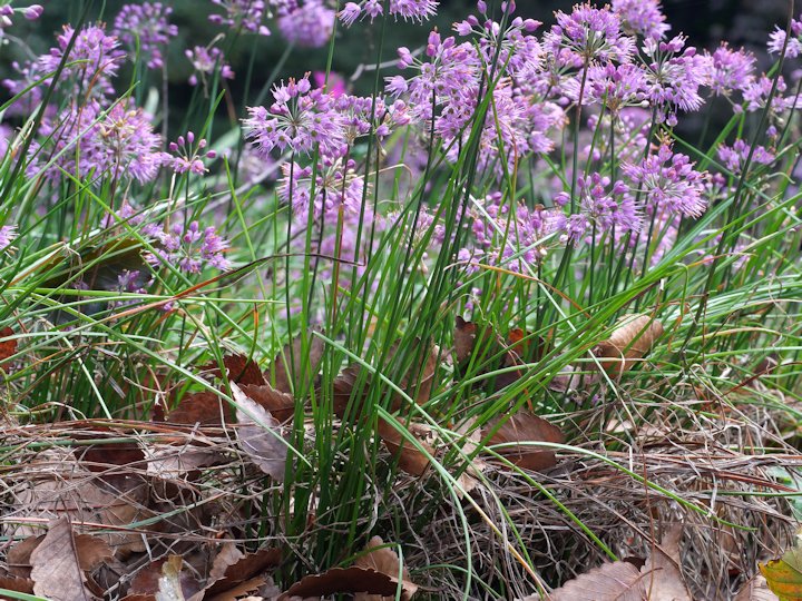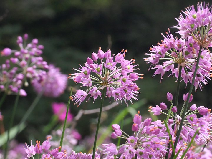 「ヤマラッキョウ」は東北地方南部から九州にかけて分布するキジカクシ目ヒガンバナ科ネギ属の多年草です。山地の草原や湿地の周辺などに生育し,草丈は30cmから60cmになります。 地下には球根があり,春にはそこから広線形で長い葉を数枚伸ばします。花期は9月から10月で,長い花茎を伸ばしその先に球状の散形花序をつけ,紅紫色の花を多数咲かせます。名前は地下にある球根が「ラッキョウ」に似ていることが由来になっています。