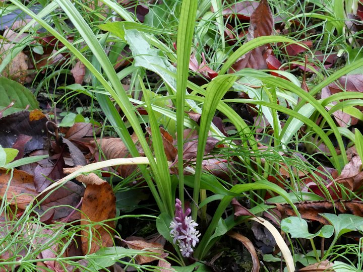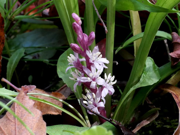 「キチジョウソウ」は関東地方から九州にかけて分布するキジカクシ目キジカクシ科キチジョウソウ属の常緑の多年草です。山地の林内などに生育するほか,観賞用として植栽されることもあります。 地下茎は長く伸びて広がり,多数の根を出し所々に葉を伸ばします。葉は根生葉で線形をしています。花期は10月から11月で,根元から穂状花序をつけ,淡紫色の花を咲かせます。本種は,花が咲くとよい事があるといわれ,それが「吉祥草」の名前の由来になっています。