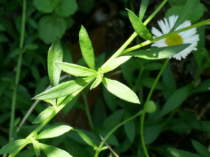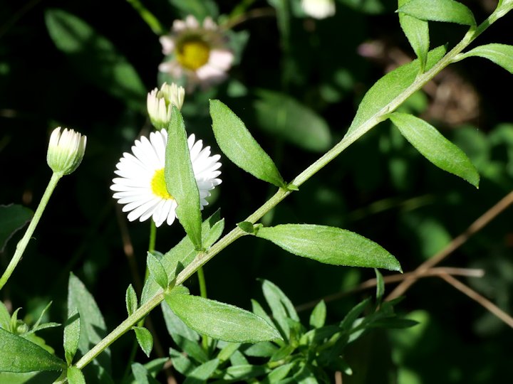 「ペラペラヨメナ」は中央アメリカ原産のキク目キク科ムカシヨモギ属の多年草です。日本への渡来時期は,1949年に京都市で確認されました。現在では関東地方から九州にかけて分布し,河川の土手や石垣などで見ることができます。 茎は細く,基部で分岐して斜上し,草丈は20cmから40cm程度になります。下部の葉は柄があり3裂から5裂しますが,上部の葉は柄がなく長楕円形で縁は全縁で互生します。花期は5月から11月で,白色の頭状花を咲かせます。